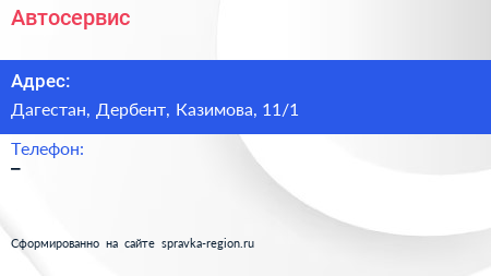 Автосервис по адресу Дагестан, Дербент, Казимова, 11/1 в дальнейшем Организация, размещена в следующих категориях: