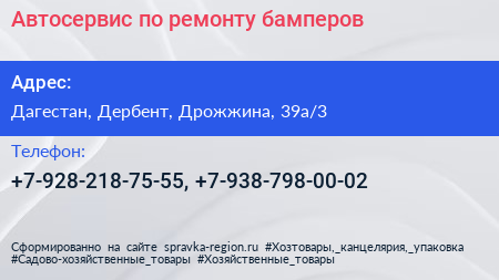 Автосервис по ремонту бамперов по адресу Дагестан, Дербент, Дрожжина, 39а/3 в дальнейшем Организация, размещена в следующих категориях: