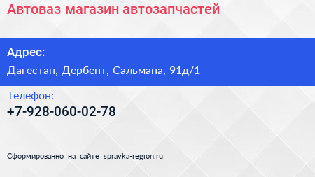 Автоваз, магазин автозапчастей по адресу Дагестан, Дербент, Сальмана, 91д/1 в дальнейшем Организация, размещена в следующих категориях: