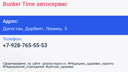 Bunker Time, автосервис по адресу Дагестан, Дербент, Ленина, 3 в дальнейшем Организация, размещена в следующих категориях: