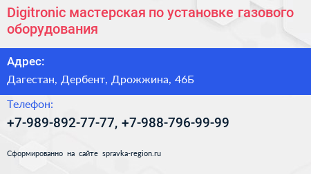 Digitronic, мастерская по установке газового оборудования по адресу Дагестан, Дербент, Дрожжина, 46Б в дальнейшем Организация, размещена в следующих категориях: