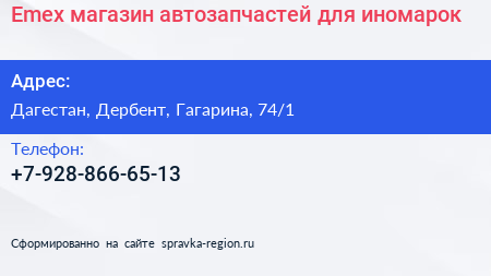 Emex, магазин автозапчастей для иномарок по адресу Дагестан, Дербент, Гагарина, 74/1 в дальнейшем Организация, размещена в следующих категориях: