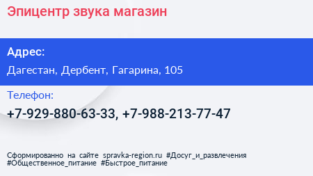 Эпицентр звука, магазин по адресу Дагестан, Дербент, Гагарина, 105 в дальнейшем Организация, размещена в следующих категориях: