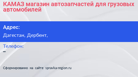 КАМАЗ, магазин автозапчастей для грузовых автомобилей по адресу Дагестан, Дербент, в дальнейшем Организация, размещена в следующих категориях: