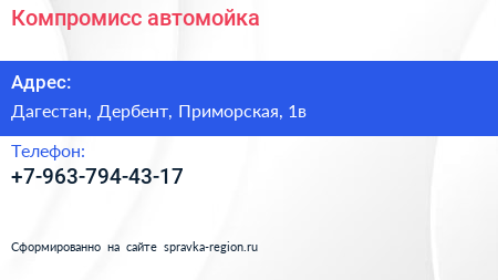 Компромисс, автомойка по адресу Дагестан, Дербент, Приморская, 1в в дальнейшем Организация, размещена в следующих категориях: