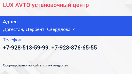 LUX-AVTO, установочный центр по адресу Дагестан, Дербент, Свердлова, 4 в дальнейшем Организация, размещена в следующих категориях: