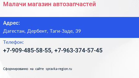 Малачи, магазин автозапчастей по адресу Дагестан, Дербент, Таги-Заде, 39 в дальнейшем Организация, размещена в следующих категориях: