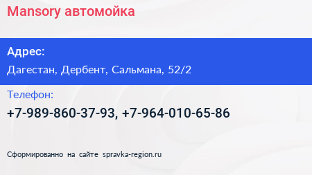 Mansory, автомойка по адресу Дагестан, Дербент, Сальмана, 52/2 в дальнейшем Организация, размещена в следующих категориях: