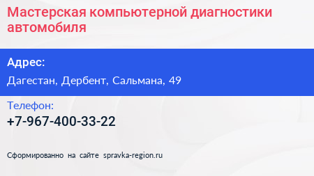 Мастерская компьютерной диагностики автомобиля по адресу Дагестан, Дербент, Сальмана, 49 в дальнейшем Организация, размещена в следующих категориях: