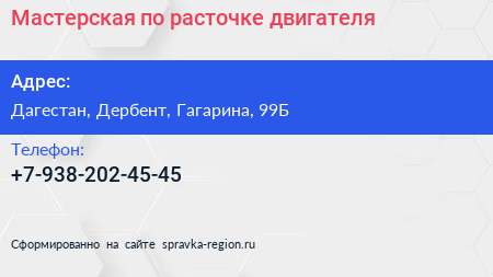 Мастерская по расточке двигателя по адресу Дагестан, Дербент, Гагарина, 99Б в дальнейшем Организация, размещена в следующих категориях: