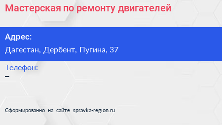 Мастерская по ремонту двигателей по адресу Дагестан, Дербент, Пугина, 37 в дальнейшем Организация, размещена в следующих категориях: