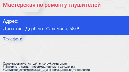 Мастерская по ремонту глушителей по адресу Дагестан, Дербент, Сальмана, 58/9 в дальнейшем Организация, размещена в следующих категориях: