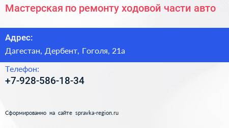 Мастерская по ремонту ходовой части авто по адресу Дагестан, Дербент, Гоголя, 21а в дальнейшем Организация, размещена в следующих категориях: