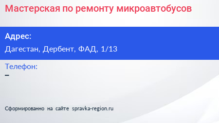 Мастерская по ремонту микроавтобусов по адресу Дагестан, Дербент, ФАД, 1/13 в дальнейшем Организация, размещена в следующих категориях:
