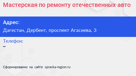 Мастерская по ремонту отечественных авто по адресу Дагестан, Дербент, проспект Агасиева, 3 в дальнейшем Организация, размещена в следующих категориях: