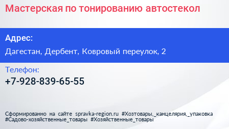 Мастерская по тонированию автостекол по адресу Дагестан, Дербент, Ковровый переулок, 2 в дальнейшем Организация, размещена в следующих категориях: