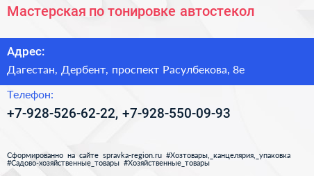 Мастерская по тонировке автостекол по адресу Дагестан, Дербент, проспект Расулбекова, 8е в дальнейшем Организация, размещена в следующих категориях: