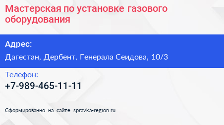 Мастерская по установке газового оборудования по адресу Дагестан, Дербент, Генерала Сеидова, 10/3 в дальнейшем Организация, размещена в следующих категориях: