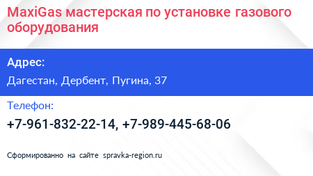 MaxiGas, мастерская по установке газового оборудования по адресу Дагестан, Дербент, Пугина, 37 в дальнейшем Организация, размещена в следующих категориях: