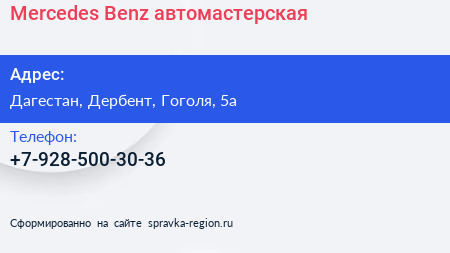 Mercedes-Benz, автомастерская по адресу Дагестан, Дербент, Гоголя, 5а в дальнейшем Организация, размещена в следующих категориях: