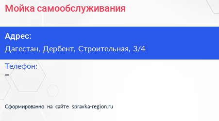 Мойка самообслуживания по адресу Дагестан, Дербент, Строительная, 3/4 в дальнейшем Организация, размещена в следующих категориях:
