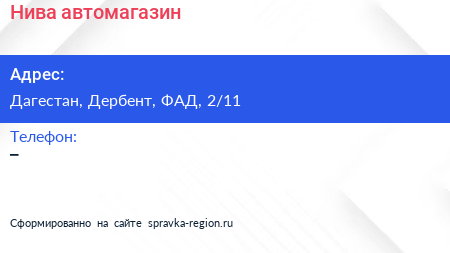 Нива, автомагазин по адресу Дагестан, Дербент, ФАД, 2/11 в дальнейшем Организация, размещена в следующих категориях: