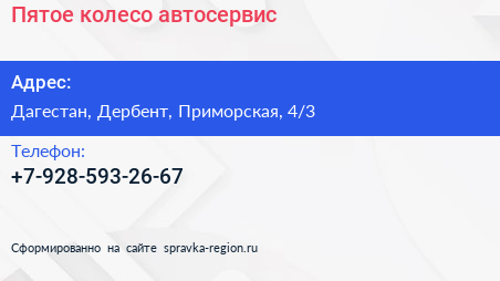 Пятое колесо, автосервис по адресу Дагестан, Дербент, Приморская, 4/3 в дальнейшем Организация, размещена в следующих категориях:
