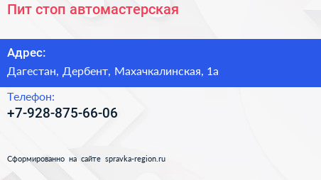 Пит-стоп, автомастерская по адресу Дагестан, Дербент, Махачкалинская, 1а в дальнейшем Организация, размещена в следующих категориях:
