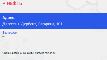 Р НЕФТЬ по адресу Дагестан, Дербент, Гагарина, 101 в дальнейшем Организация, размещена в следующих категориях: