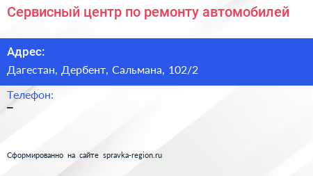 Сервисный центр по ремонту автомобилей по адресу Дагестан, Дербент, Сальмана, 102/2 в дальнейшем Организация, размещена в следующих категориях: