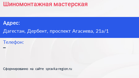 Шиномонтажная мастерская по адресу Дагестан, Дербент, проспект Агасиева, 21а/1 в дальнейшем Организация, размещена в следующих категориях: