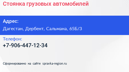 Стоянка грузовых автомобилей по адресу Дагестан, Дербент, Сальмана, 65Б/3 в дальнейшем Организация, размещена в следующих категориях: