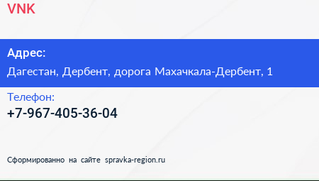 VNK по адресу Дагестан, Дербент, дорога Махачкала-Дербент, 1 в дальнейшем Организация, размещена в следующих категориях: