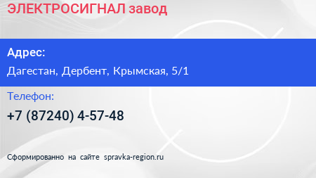 ЭЛЕКТРОСИГНАЛ, завод по адресу Дагестан, Дербент, Крымская, 5/1 в дальнейшем Организация, размещена в следующих категориях: