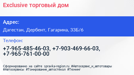 Exclusive, торговый дом по адресу Дагестан, Дербент, Гагарина, 33Б/6 в дальнейшем Организация, размещена в следующих категориях: