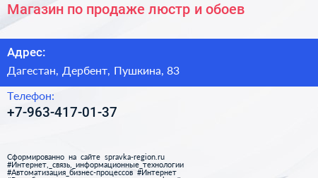 Магазин по продаже люстр и обоев по адресу Дагестан, Дербент, Пушкина, 83 в дальнейшем Организация, размещена в следующих категориях: