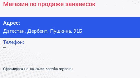 Магазин по продаже занавесок по адресу Дагестан, Дербент, Пушкина, 91Б в дальнейшем Организация, размещена в следующих категориях: