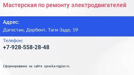 Мастерская по ремонту электродвигателей по адресу Дагестан, Дербент, Таги-Заде, 59 в дальнейшем Организация, размещена в следующих категориях: