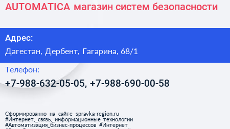 AUTOMATICA, магазин систем безопасности по адресу Дагестан, Дербент, Гагарина, 68/1 в дальнейшем Организация, размещена в следующих категориях:
