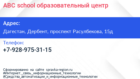 ABC school, образовательный центр по адресу Дагестан, Дербент, проспект Расулбекова, 15д в дальнейшем Организация, размещена в следующих категориях: