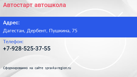 Автостарт, автошкола по адресу Дагестан, Дербент, Пушкина, 75 в дальнейшем Организация, размещена в следующих категориях:
