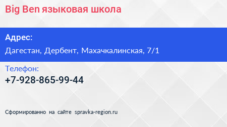Big Ben, языковая школа по адресу Дагестан, Дербент, Махачкалинская, 7/1 в дальнейшем Организация, размещена в следующих категориях: