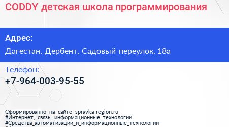CODDY, детская школа программирования по адресу Дагестан, Дербент, Садовый переулок, 18а в дальнейшем Организация, размещена в следующих категориях: