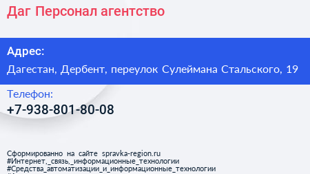 Даг Персонал, агентство по адресу Дагестан, Дербент, переулок Сулеймана Стальского, 19 в дальнейшем Организация, размещена в следующих категориях: