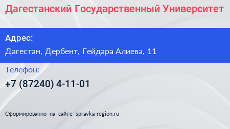 Дагестанский Государственный Университет по адресу Дагестан, Дербент, Гейдара Алиева, 11 в дальнейшем Организация, размещена в следующих категориях: