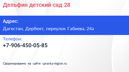 Дельфин, детский сад №28 по адресу Дагестан, Дербент, переулок Габиева, 24а в дальнейшем Организация, размещена в следующих категориях: