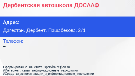 Дербентская автошкола ДОСААФ по адресу Дагестан, Дербент, Пашабекова, 2/1 в дальнейшем Организация, размещена в следующих категориях: