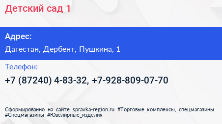 Детский сад №1 по адресу Дагестан, Дербент, Пушкина, 1 в дальнейшем Организация, размещена в следующих категориях: