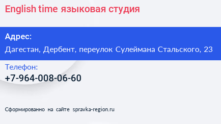 English time, языковая студия по адресу Дагестан, Дербент, переулок Сулеймана Стальского, 23 в дальнейшем Организация, размещена в следующих категориях: