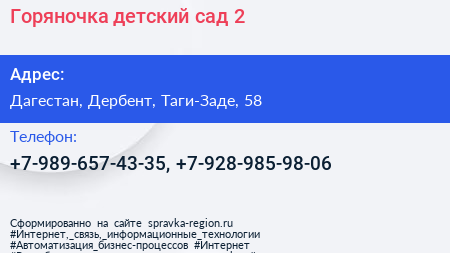 Горяночка, детский сад №2 по адресу Дагестан, Дербент, Таги-Заде, 58 в дальнейшем Организация, размещена в следующих категориях: